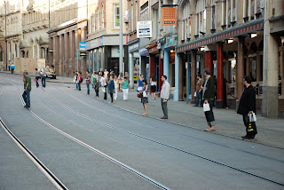 A week ago I took part in a work commissioned for The Art Crawl in Nottingham by Katie Doubleday and Andrew Brown. I was given a map and instuctions for 'Stillness, Slowness and Stopping: A walk for a group in a city at night'. Kitted out with an ipod shuffle and a clear instruction to turn it on and follow its commands at exactly 7.50pm, I found myself to be part of an artwork. Immaculately timed and choreographed, the recorded directions led me and about 25 other people traverse the streets of Nottingham. The narration was monotone and factual but not unfriendly, yet commanding enough to want to follow through what it was telling you to do. Simple commands began with ‘speed up your pace until you reach Clumber Street…Slowly come to a halt and begin walking again at a normal pace.' Jointly narrated by the artists, a trust was gained to follow their verbal mapping of the city centre. Being part of a group also meant there was safety in numbers and one did not feel singled out or foolish. In fact it soon became a pleasurable experience to feel as though one were part of one physical entity that made its mark on the cityscape. The most poignant instruction to stop coincided expertly with the Council House beginning its chimes. This was when people about the streets of Nottingham began to take notice of the collection of people all stood as still as sleeping automatons, dotted about one of the busiest shopping streets in Europe.